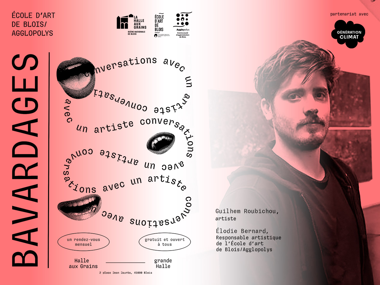 Dans le cadre du partenariat entre l’École d’art de Blois/Agglopolys et la Scène nationale de Blois pour le Festival Génération Climat, le prochain rendez-vous de BAVARDAGES se déroulera en présence de l’artiste Guilhem Roubichou et d’Élodie Bernard, responsable de l’École d’art de Blois/Agglopolys, dans la grande halle de la Halle aux Grains, Scène nationale de Blois.